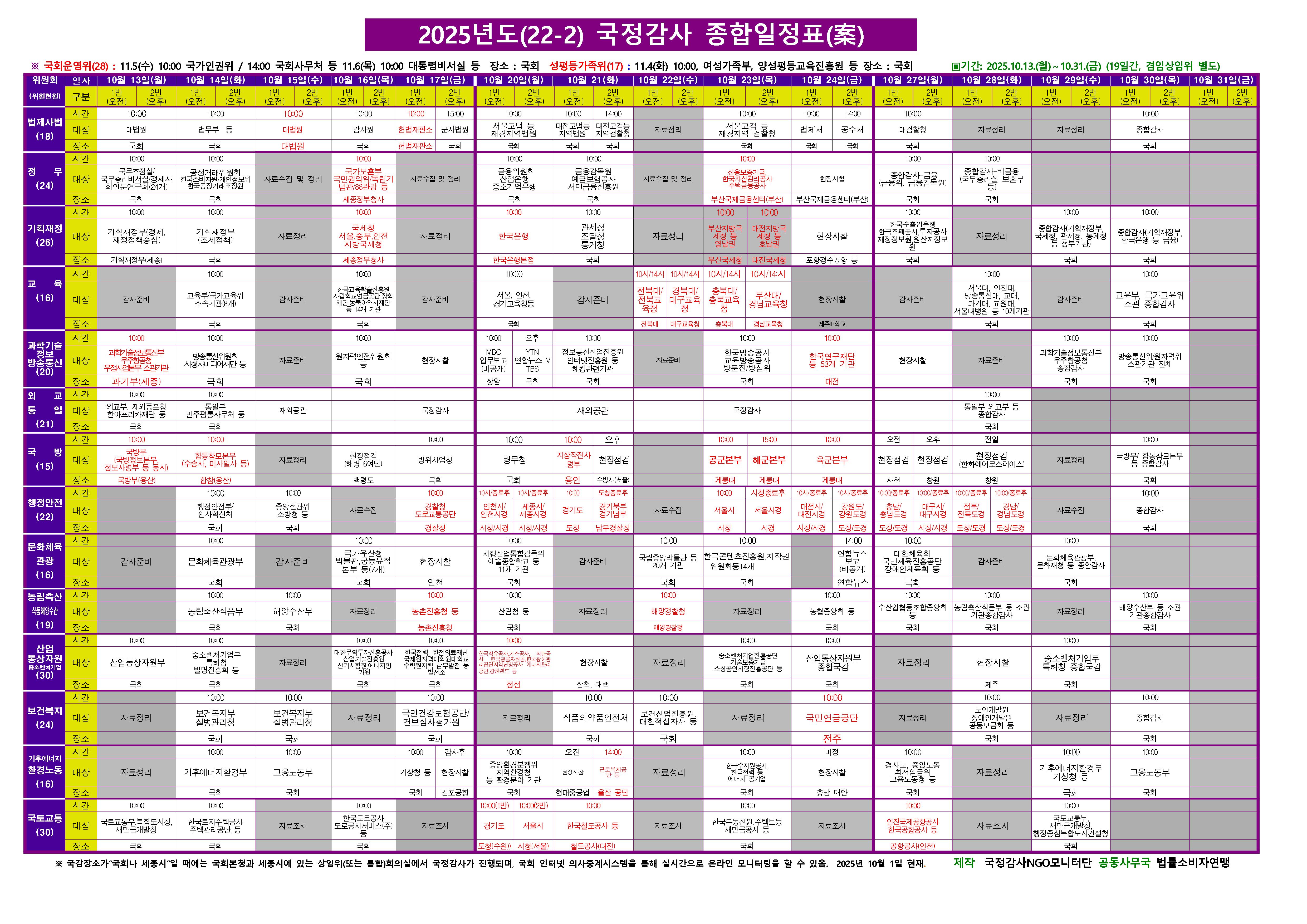 3) 2025년도 국정감사 종합일정표와 2025년도 상임위원회별 국정감사 감사위원(국회의원)명단은 법률연맹 홈페이지의 국정감사모니터단 공지사항에 게시하였사오니 확인하시면 됩니다.